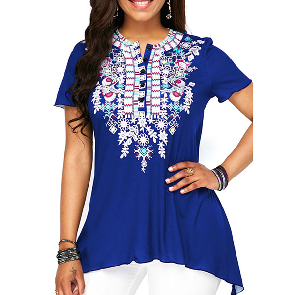 a relaxed silhouette with floral print, a button front design, an irregular hem, a round neckline, a short sleeve.