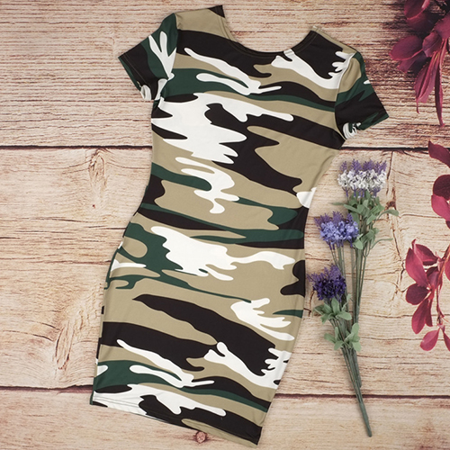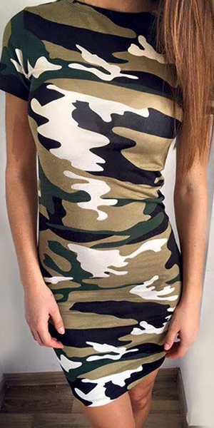 Features camouflage printed pattern,with short sleeve,round neck and slim fit design,