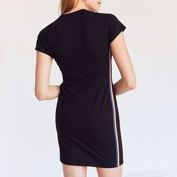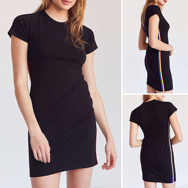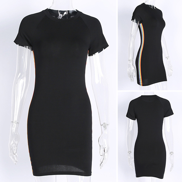 and this dress knows it. It is decorated with solid color and side stripe printed patterns, with short sleeve and round neck design,