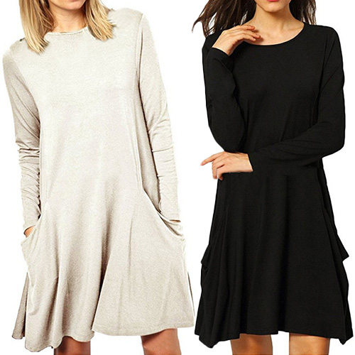 The dress features solid color and long sleeve round neck patterns, with front double pocket patterns, casual