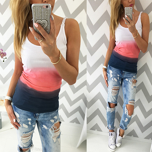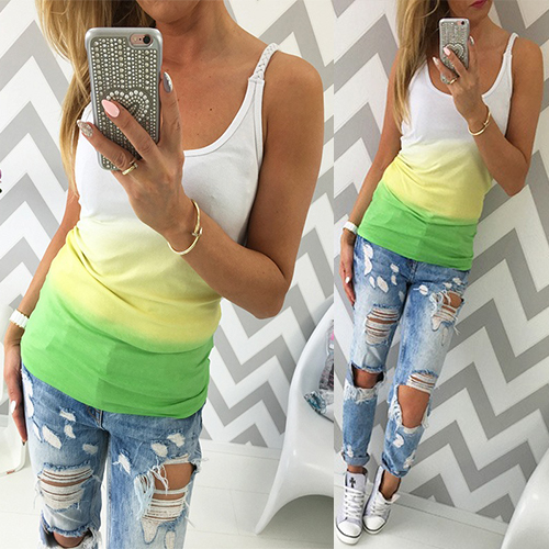 Wow,such a chic and stylish tops! Color gradient style,its soft and breathable fabric can keep you comfy all day. Try to paired with your shorts for a cool summer.