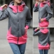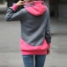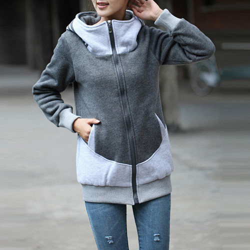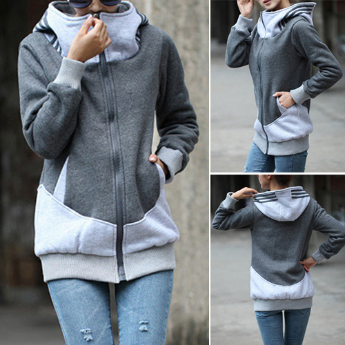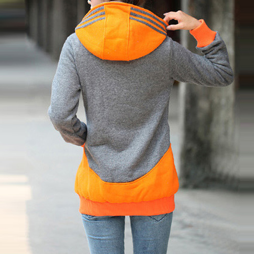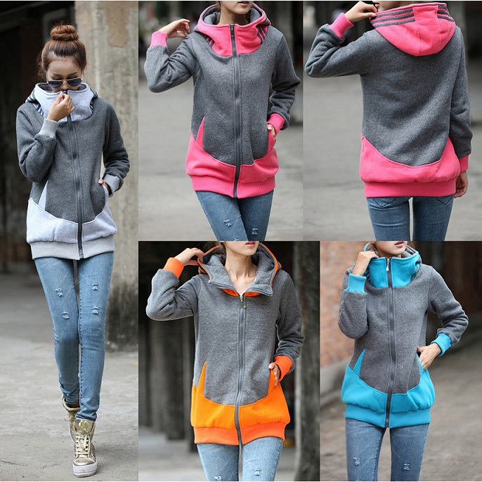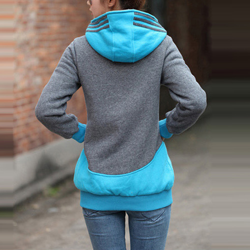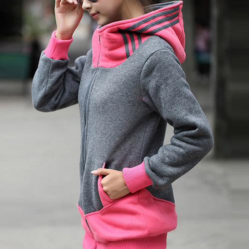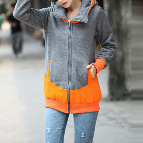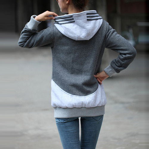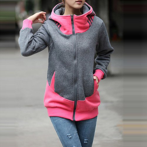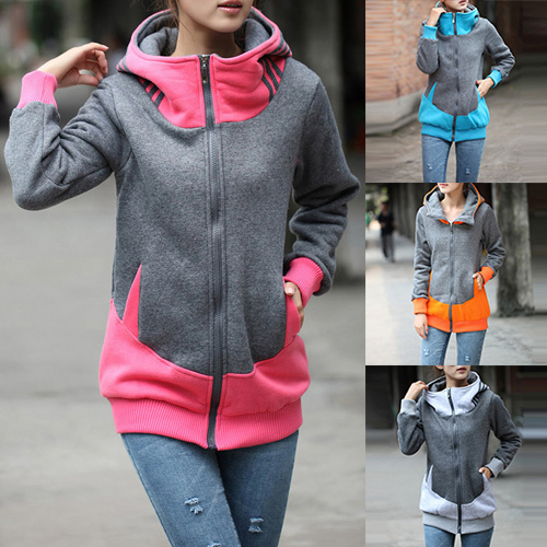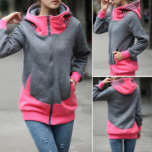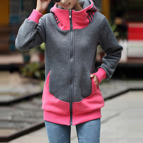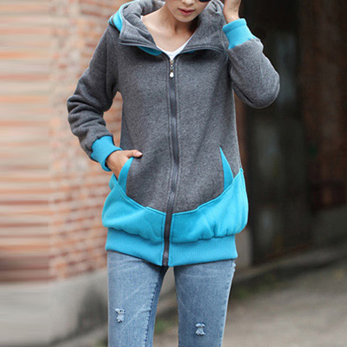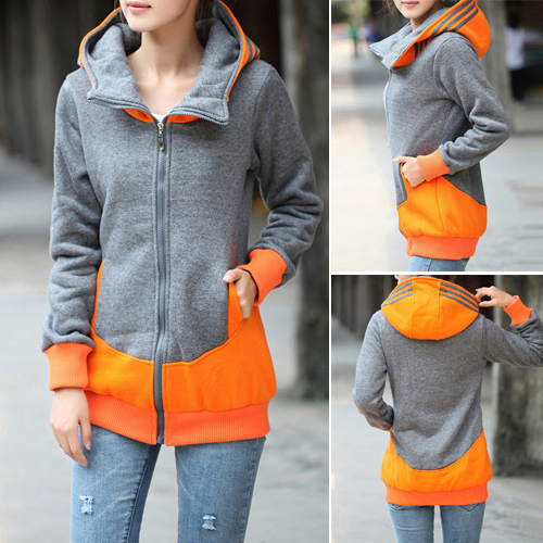 The hoodie coat is styled with color spliced design and front zipper long sleeve patterns, which