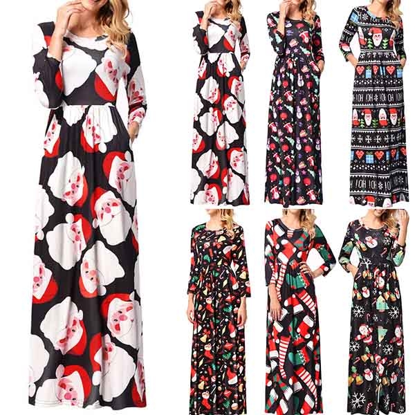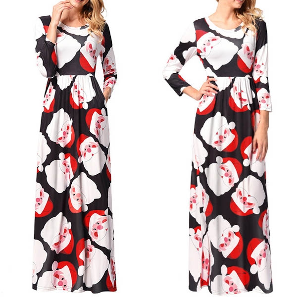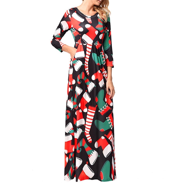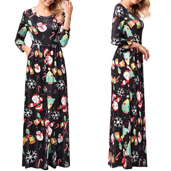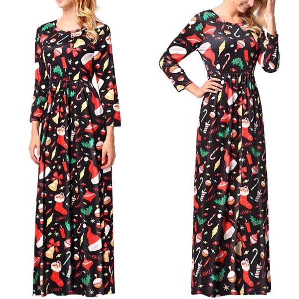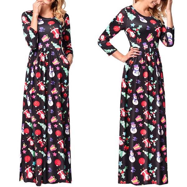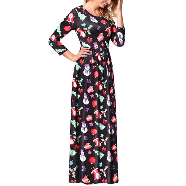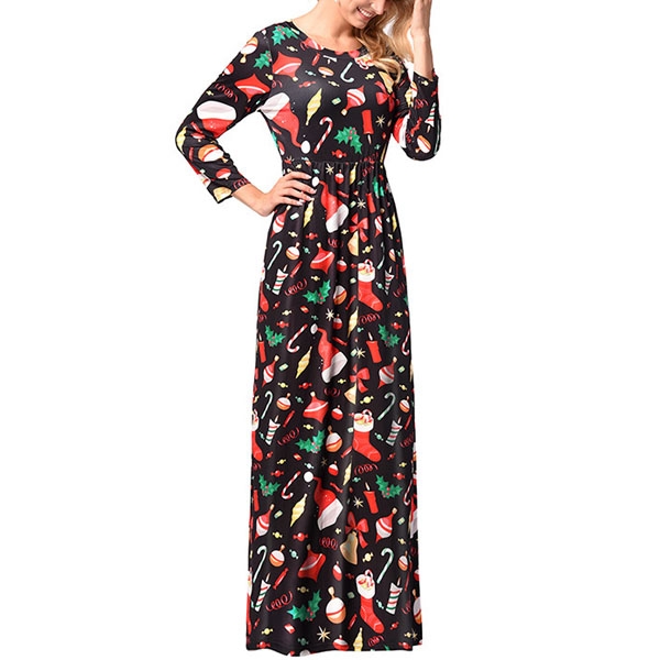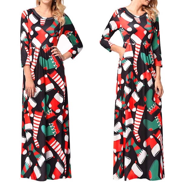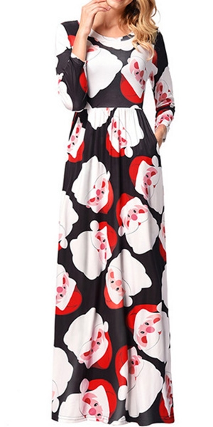 Fashion Colorful Printed Long Sleeve Round Neck Maxi Dress