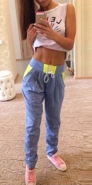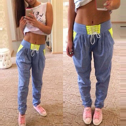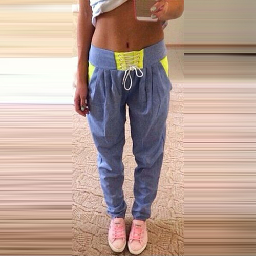 This harem pants features contrast color style,its elastic waist with lace-up design makes