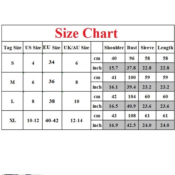 S : Bust : 96cm(37.8"); Shoulder : 40cm(15.75"); Sleeve : 58cm(22.83"); Length : 58cm(22.83");