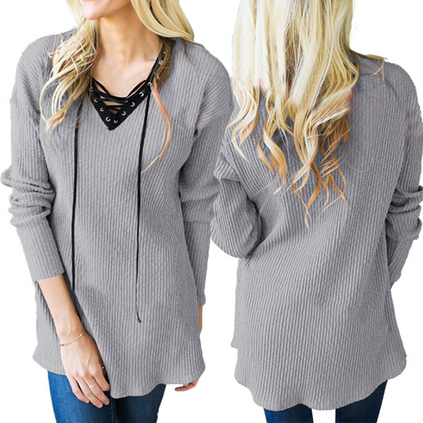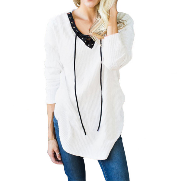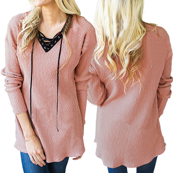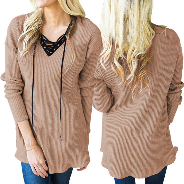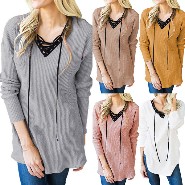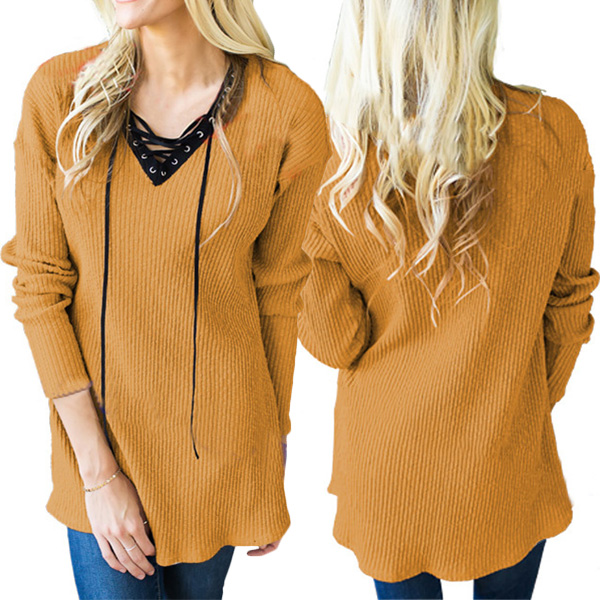 You can keep warm,cozy and feminine in this knit top. The contrast color v-neck with lace-up design is the design