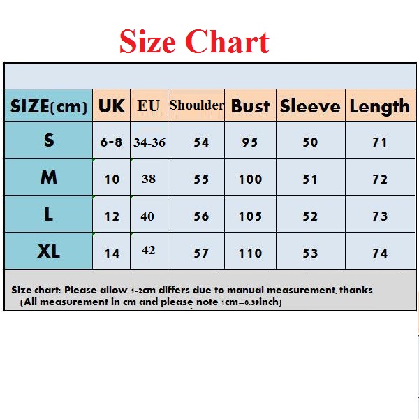 XL : Bust : 110cm(43.31"); Shoulder : 57cm(22.44"); Sleeve : 53cm(20.87"); Length : 74cm(29.13");