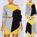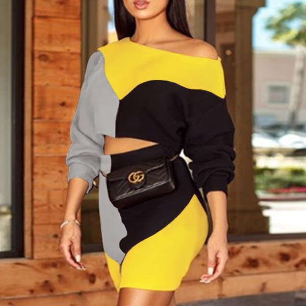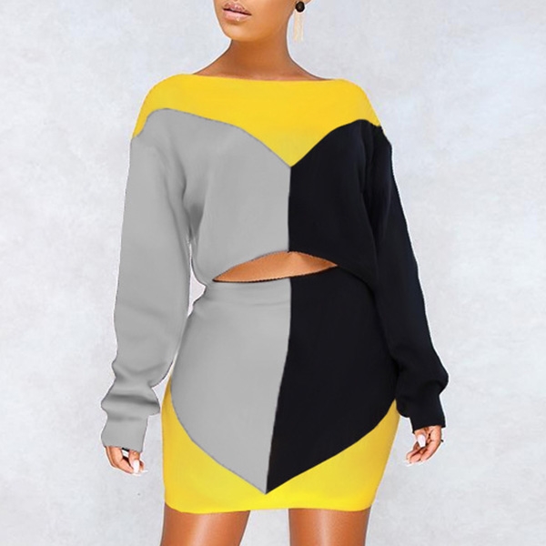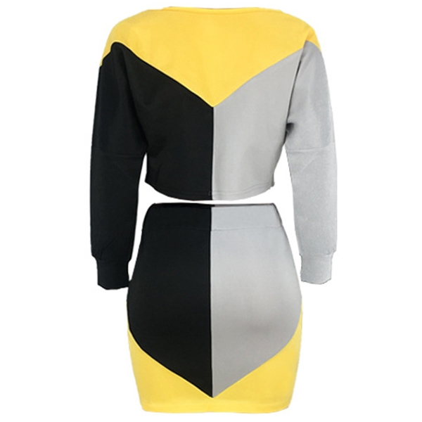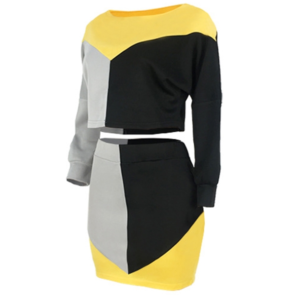 Contrast color style,including a long sleeve crop top and a high waist skirt,this two-piece set knows