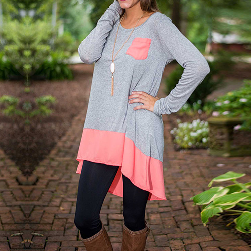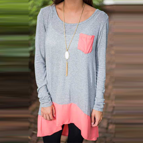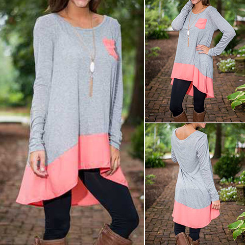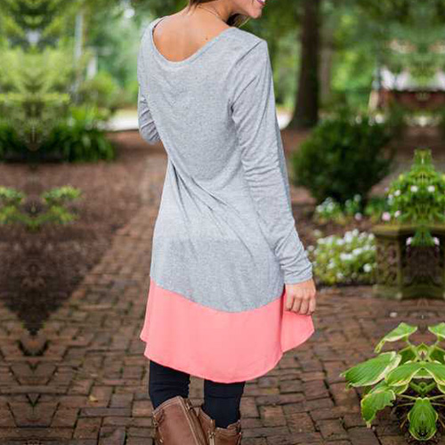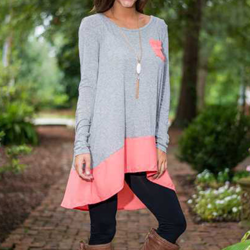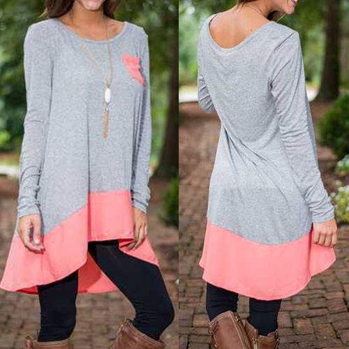 This t-shirt dress features contrast color style,with long sleeve,round neck and irregular hem design,