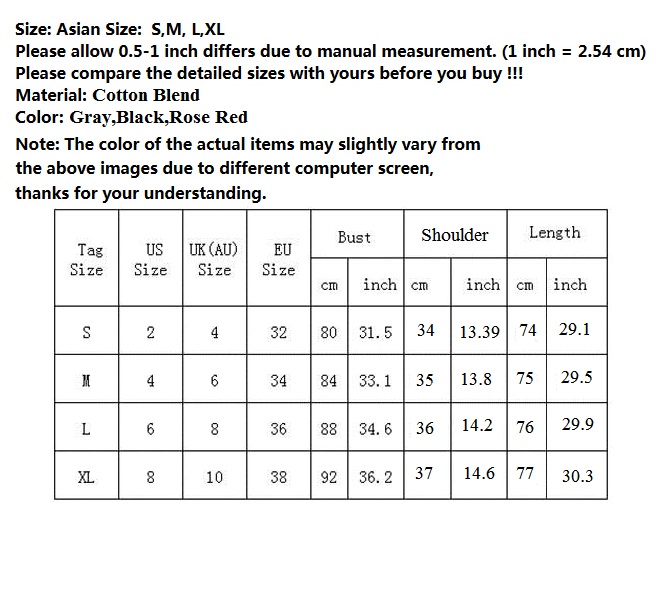 XL : Bust : 92cm(36.22"); Shoulder : 37cm(14.57"); Length : 77cm(30.31");