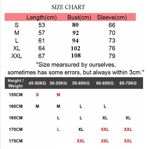 XXL : Bust : 108cm(42.52"); Sleeve : 79cm(31.1"); Length : 67cm(26.38");