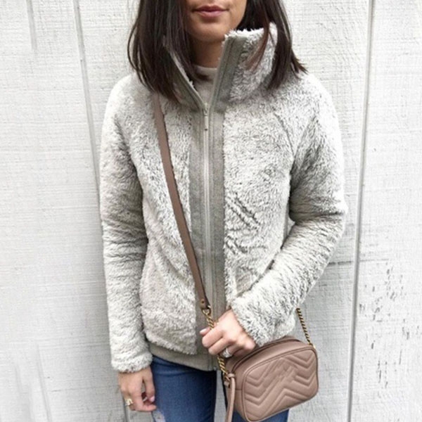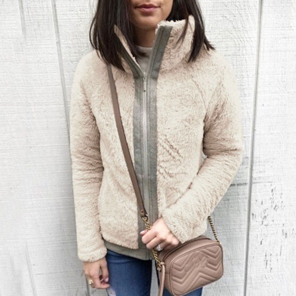 stand collar and front zipper closure,this simple yet stylish plush coat can keep you warm and comfy