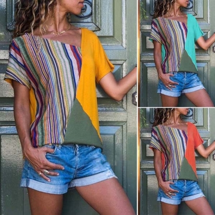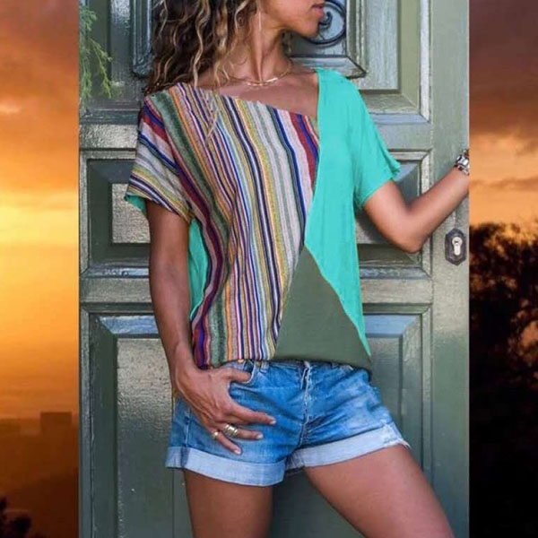 Contrast color and striped spliced design make this piece look so different,while the oblique v-neck
