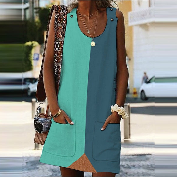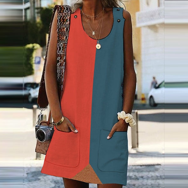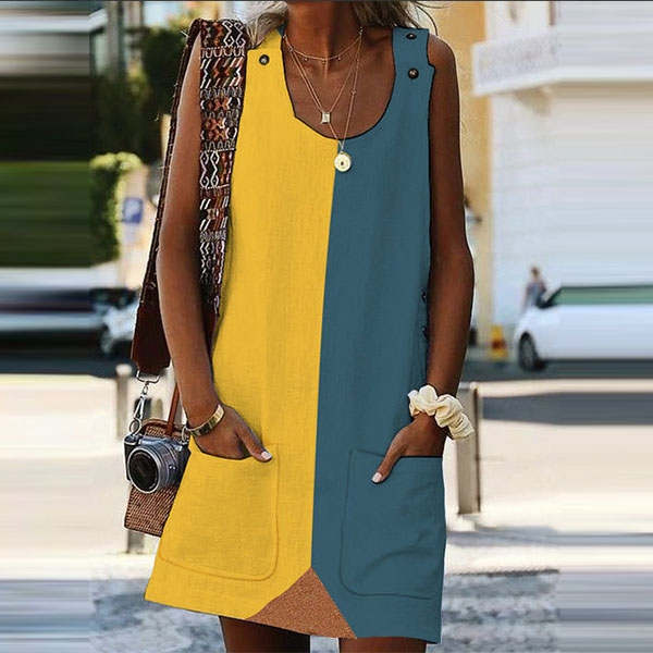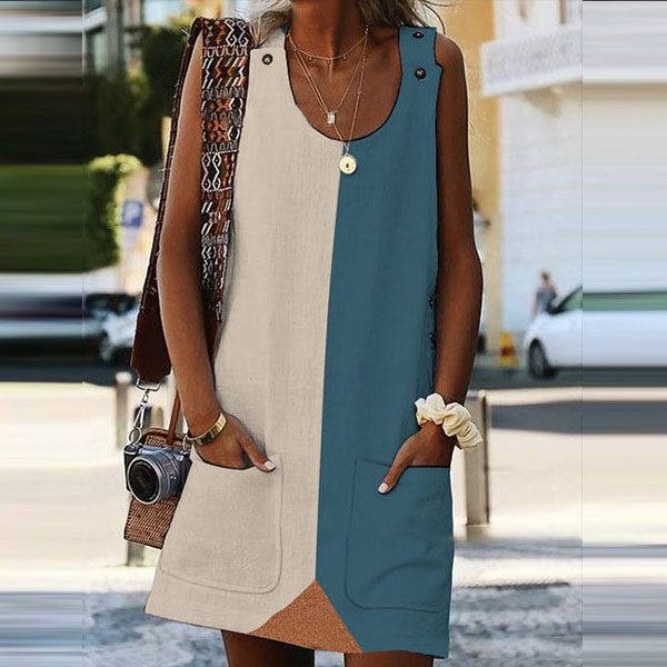 Fashion Contrast Color Round-neck Sleeveless Side Pockets Dress