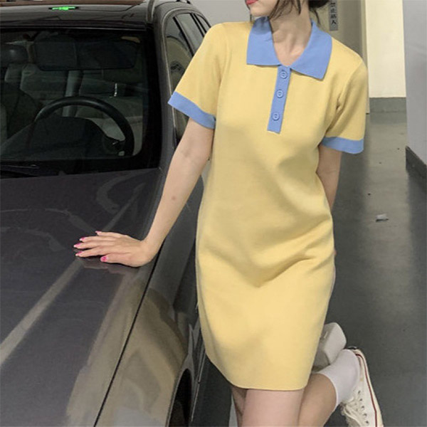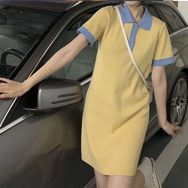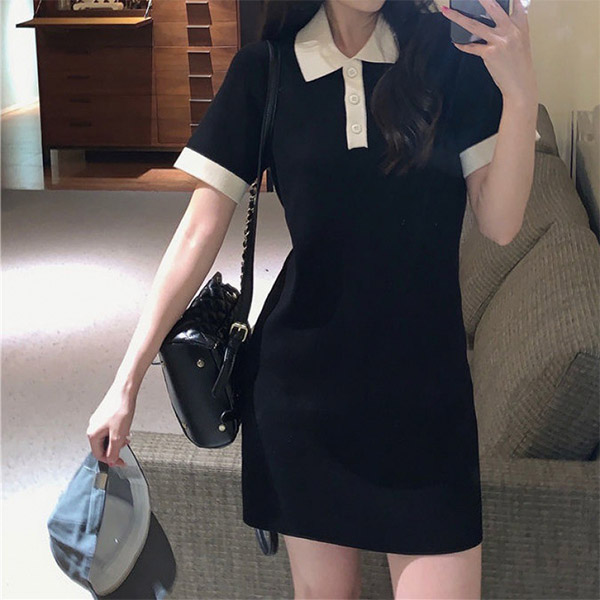 Fashion Contrast Color Short Sleeve POLO Collar Slim Fit Dress