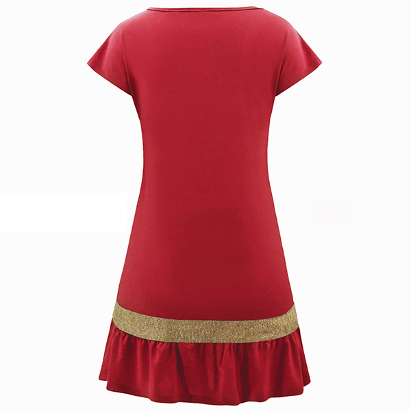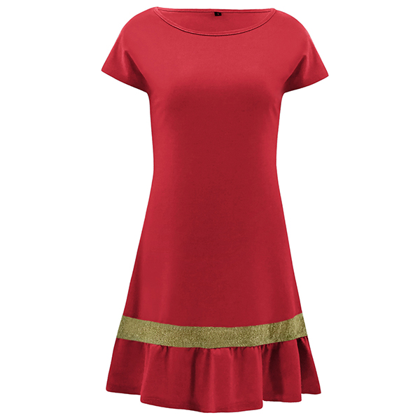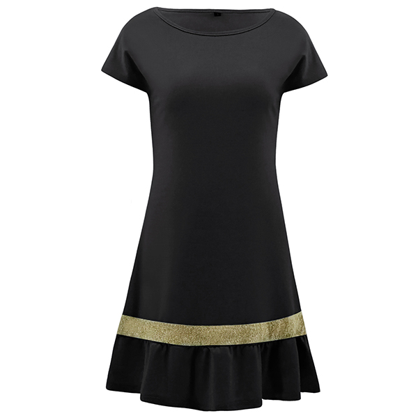 and soft polyester fabric woven,with round-neck,short sleeve and pleated hemline.One gold line underneath