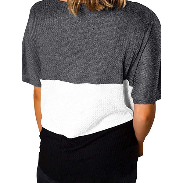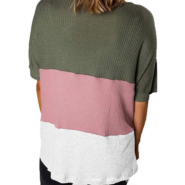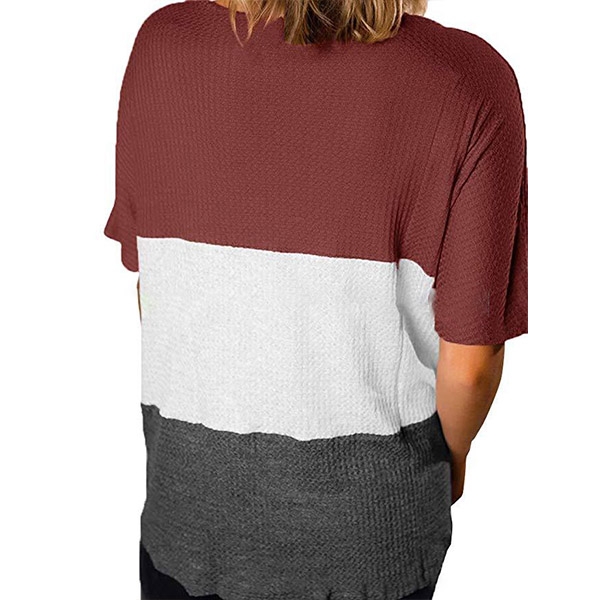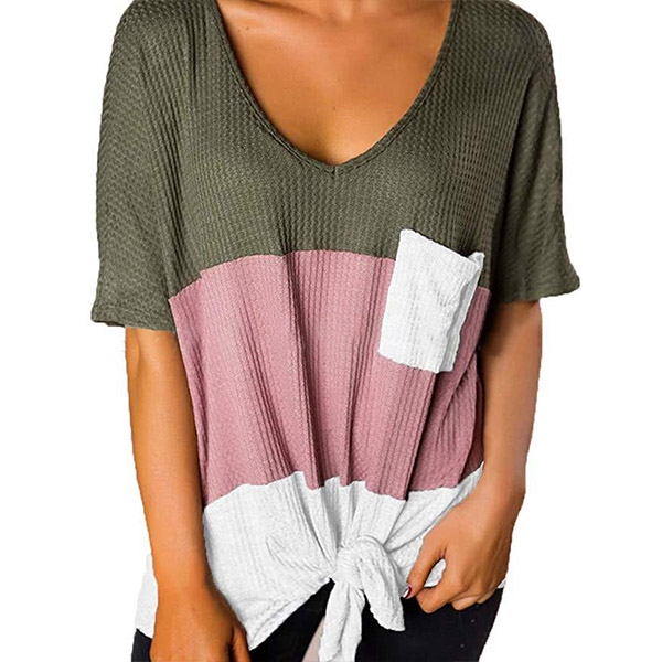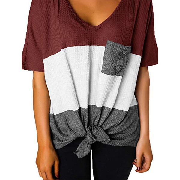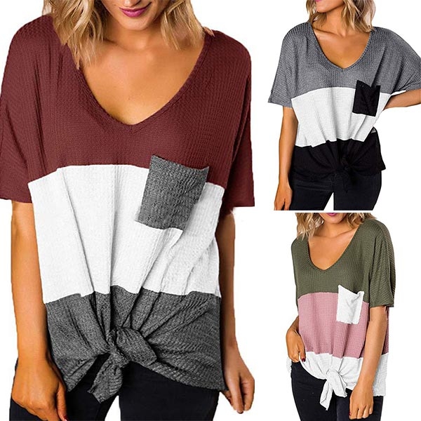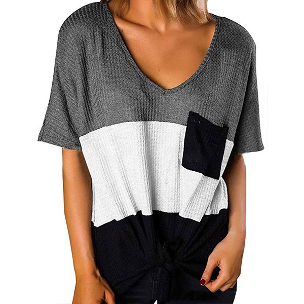 Contrast color style,finished with short sleeve,v-neck,a chest patch pocket and a loose silhouette,