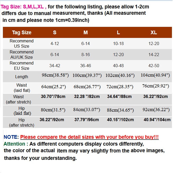 XL : Waist : 76cm(29.92"); Hips : 92cm(36.22"); Length : 104cm(40.94");