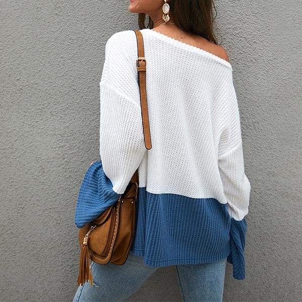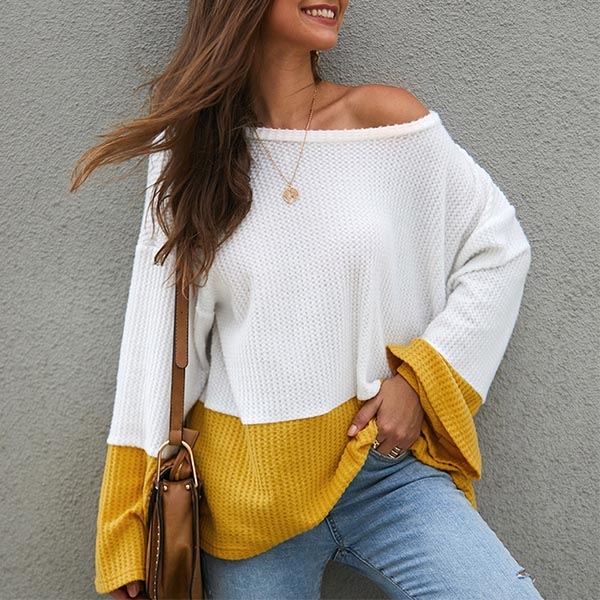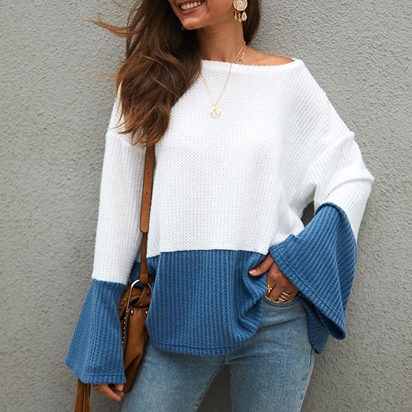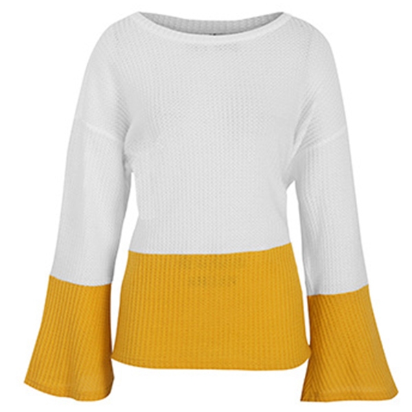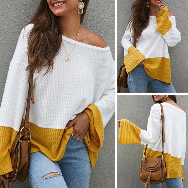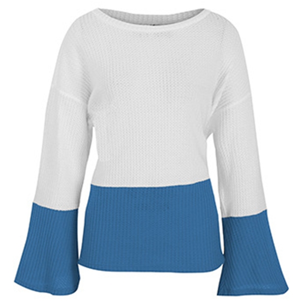 The contrast color trend is still going strong,so we suggest you this knit top which is designed with contrast color element. Moreover,the trumpet