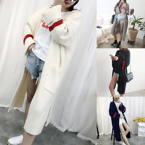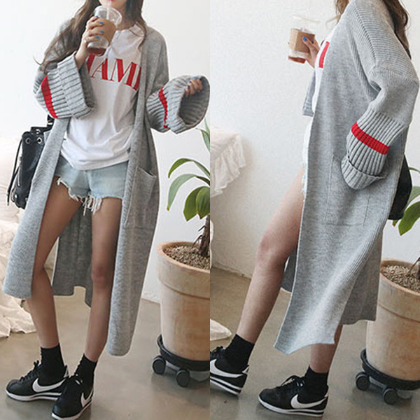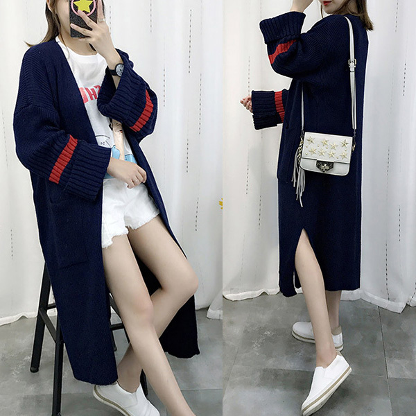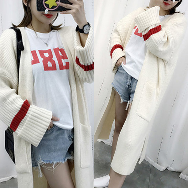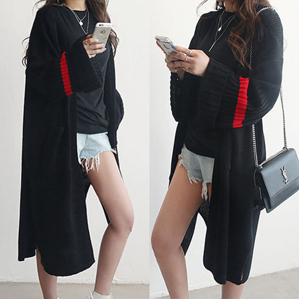 Make your fashion taste have a boost with the help of this knit cardigan. Contrast color trumpet sleeve and slit hem