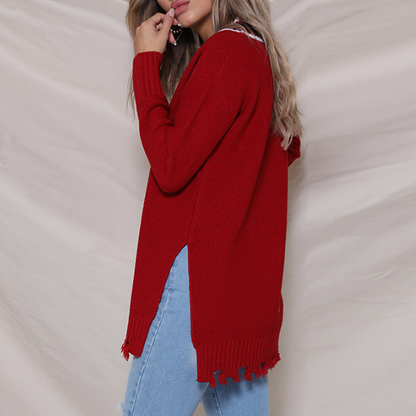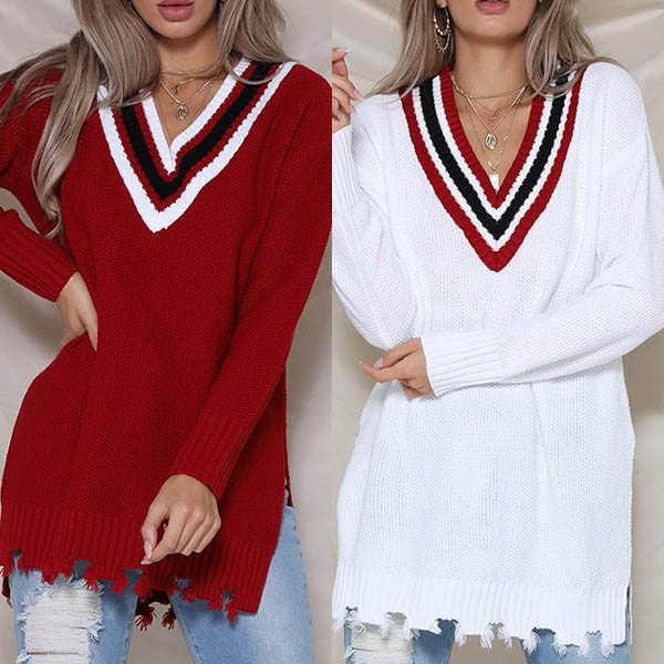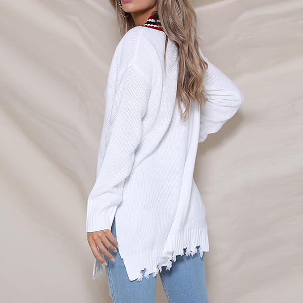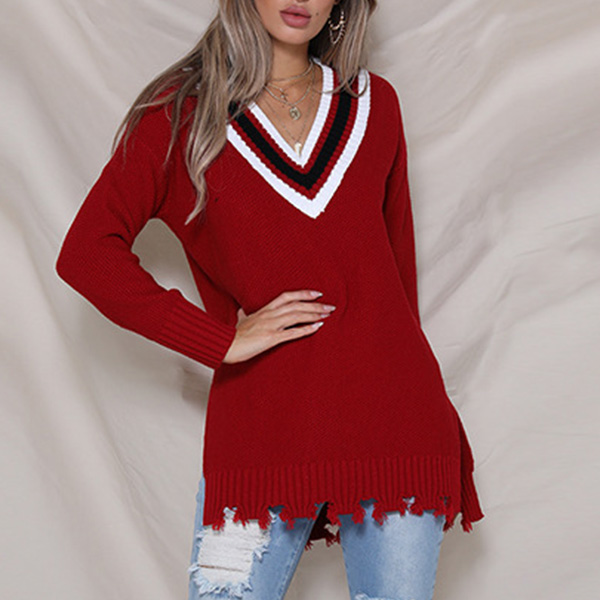 like contrast color v-neck and slit frayed hem make this piece look very attractive. You can team it