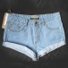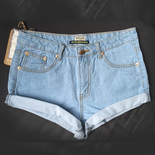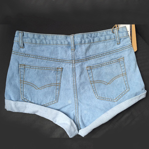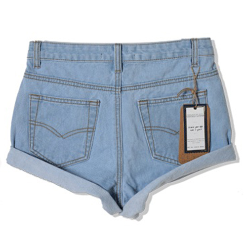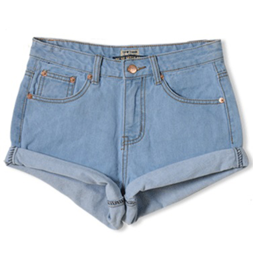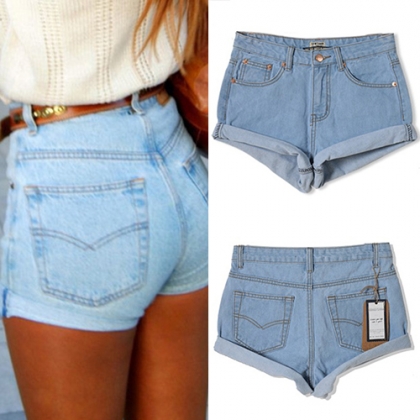 A pair of denim shorts features high rise design, four-pocket construction, a zip fly and a cuffed hem.