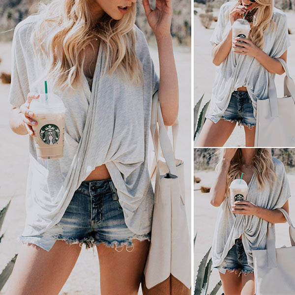 Fashion Deep V-neck Twist Short Sleeve Irregular Hemline Shirt