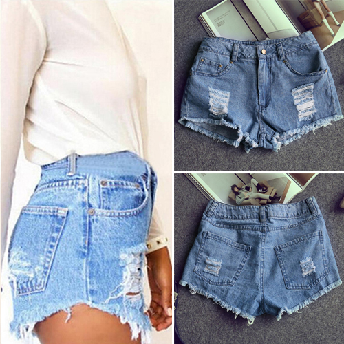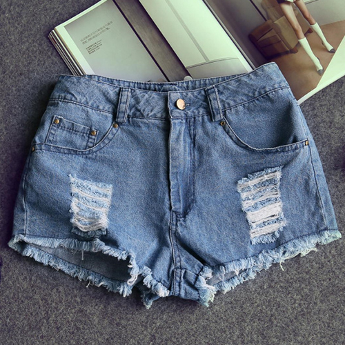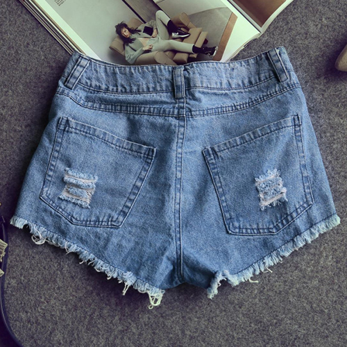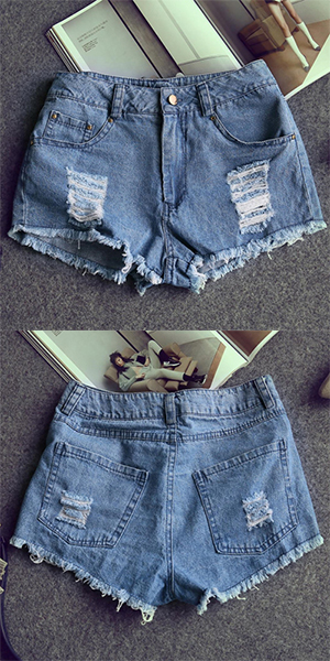 Adorned with frayed hem, rips in front, five pockets, zip fly and button closure.