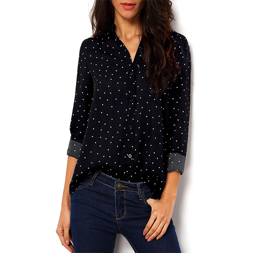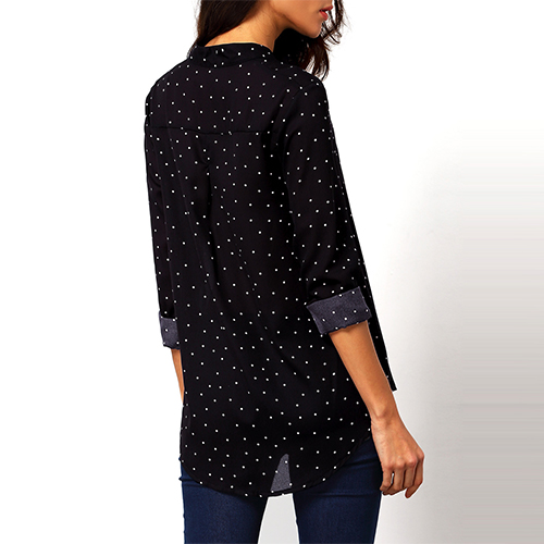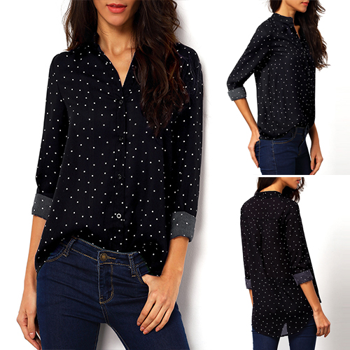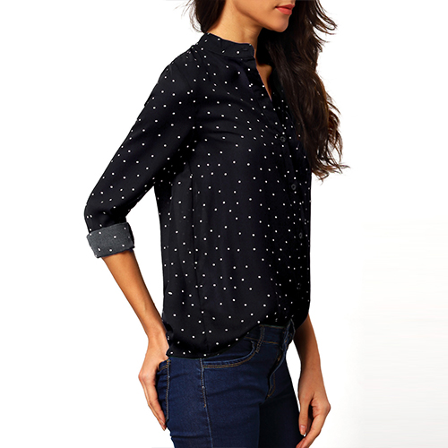 See-through style,with dots printed details,alluring yet chic and stylish. Tailored with long sleeve,stand collar and breezy chiffon