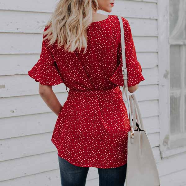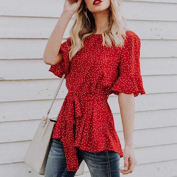 Fashion Dots Printed Trumpet Sleeve Round Neck Blouse with Waist Strap