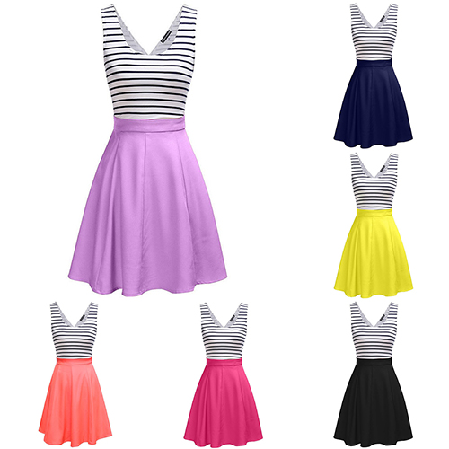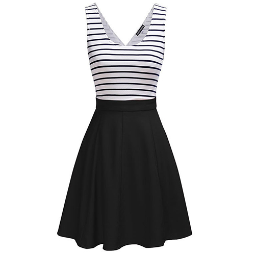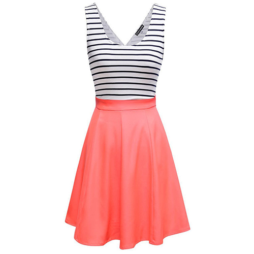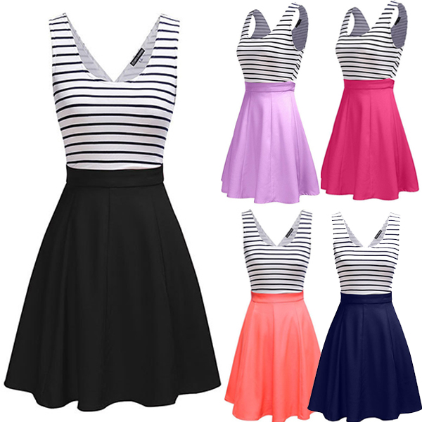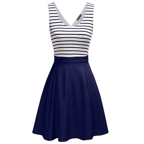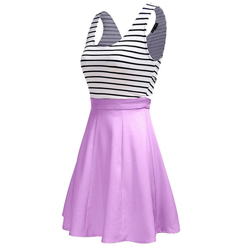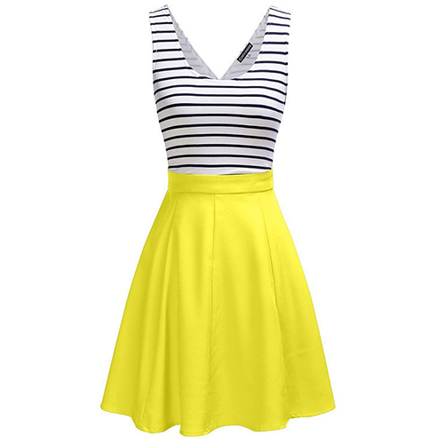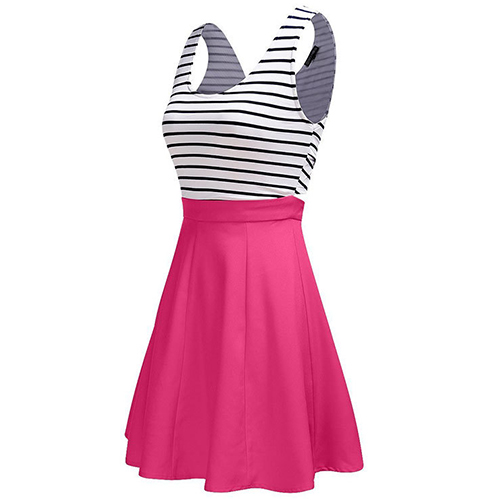 The swing dress is outfitted with color spliced and stripe design, with sleeveless patterns, glamorous and