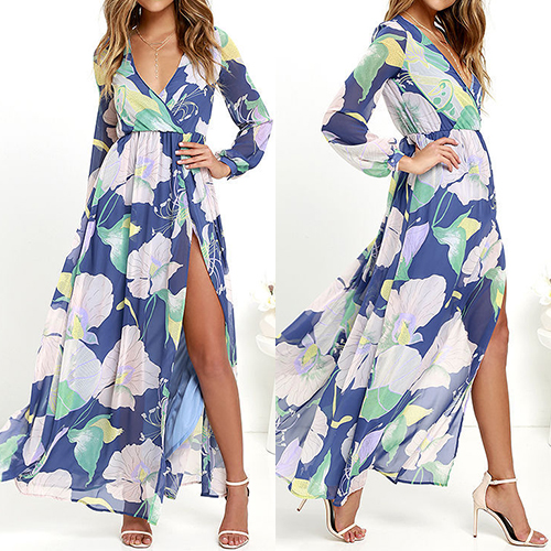 completed with floral printed patterns, with deep V-neck and long sleeve patterns, elegant and stylish. The side slit hemline