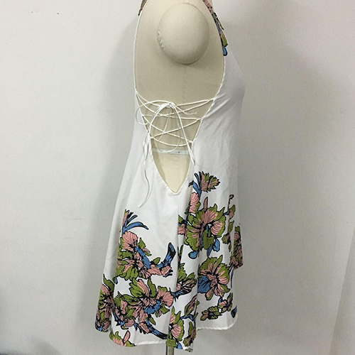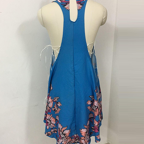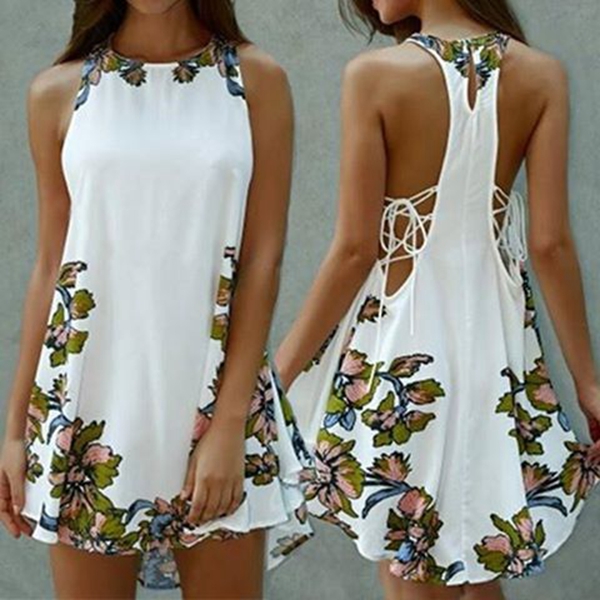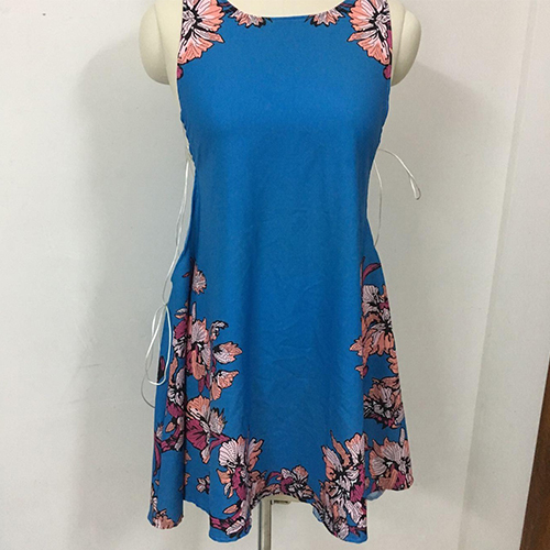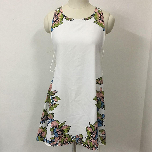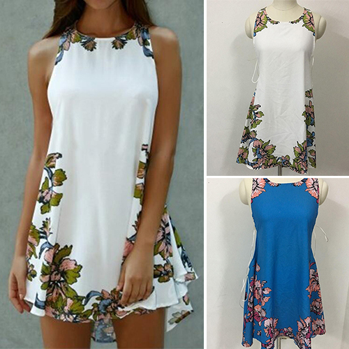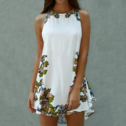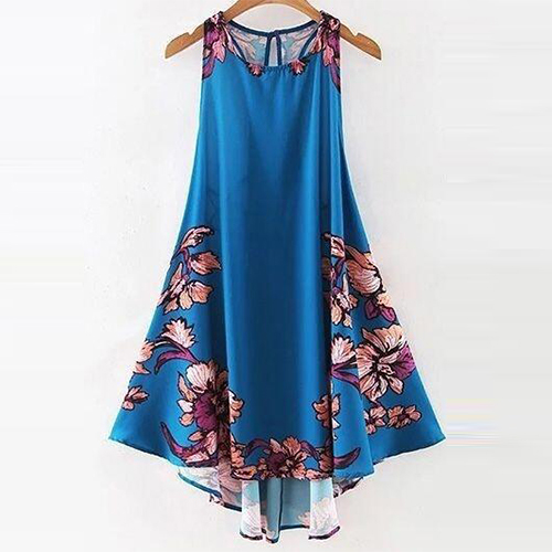 dress at the first sight. The dress is completed with floral printed patterns, with sleeveless and irregular hemline