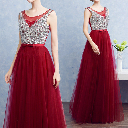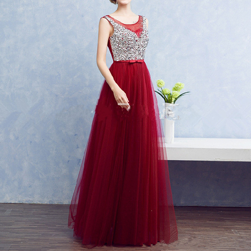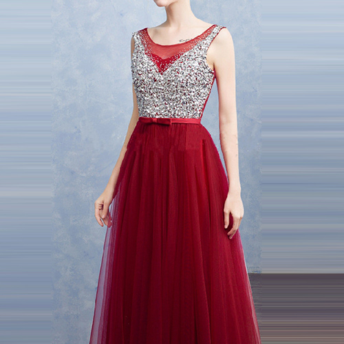 The evening dress features an elegant and fashion style. It is decorated with sleeveless