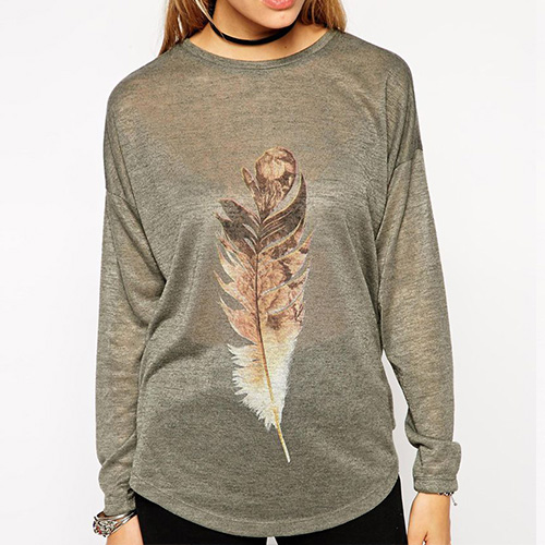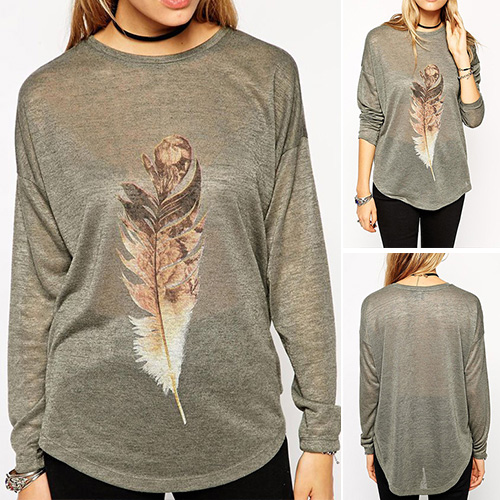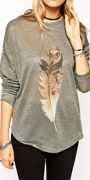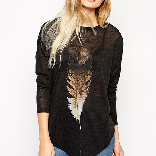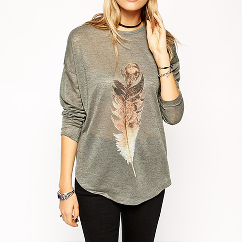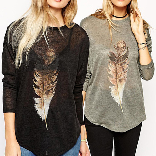 feather printed pattern,with dolman sleeve,round neck,high-low hem and a relaxed silhouette,and crafted