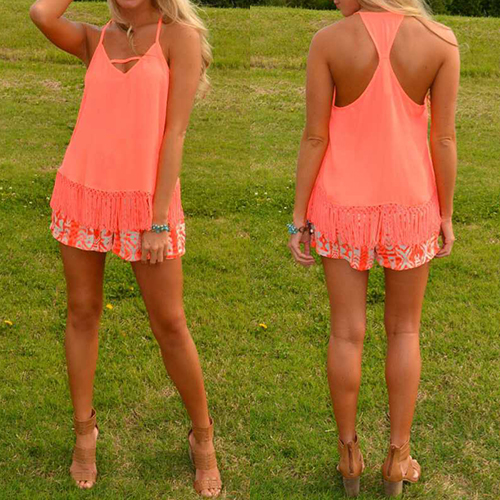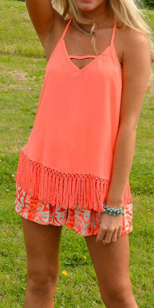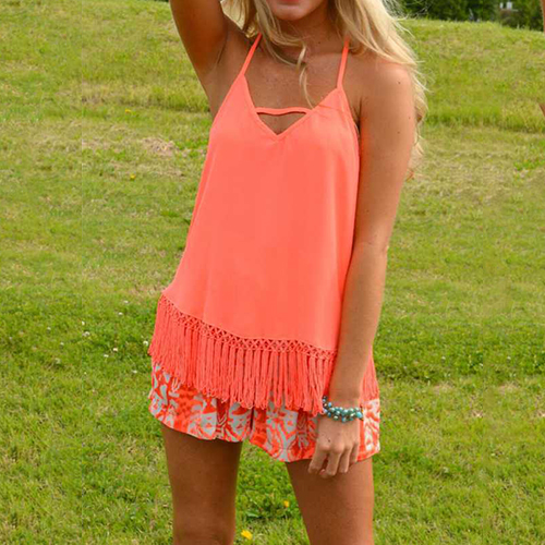 It features cami structure, fringed trim along the hem, racer back and V neckline. This top is