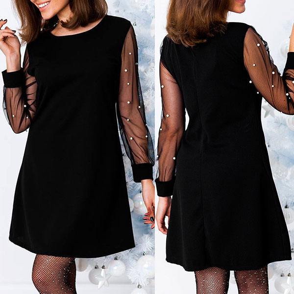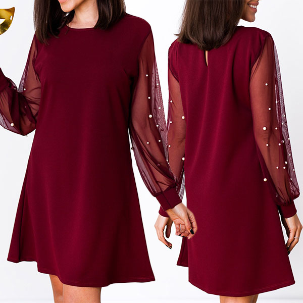 can make your eyes focused on this dress. It comes with a solid color,the gauze spliced long sleeve and beaded