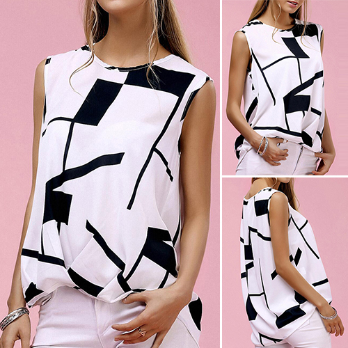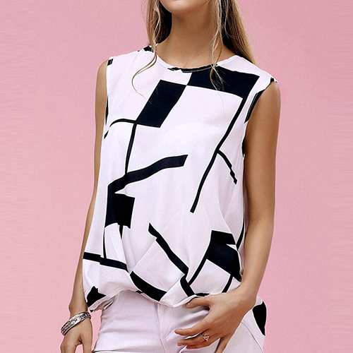 geometric print pattern,with sleeveless,round neck and a high-low hem,this simple piece can still maintain