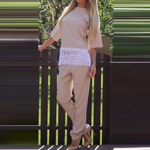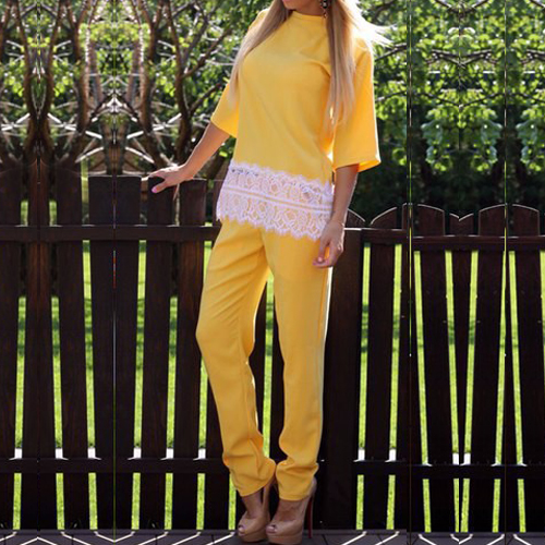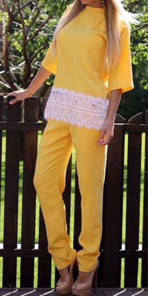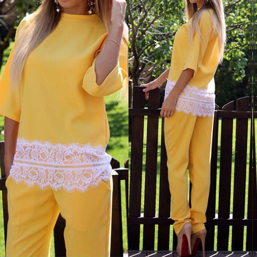 This two-piece set incluidng a top and a pants. Tops with half sleeve,round neckline and lace