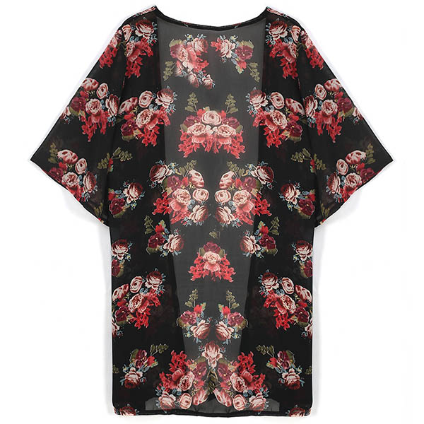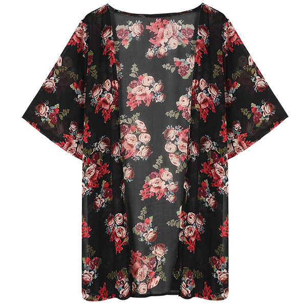Boasts vibrant floral print,with half sleeve and a loose silhouette design,this chiffon cardigan