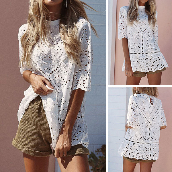 Fashion Half Sleeve Round Neck Solid Color Hollow Out Lace Top