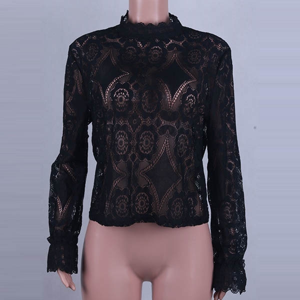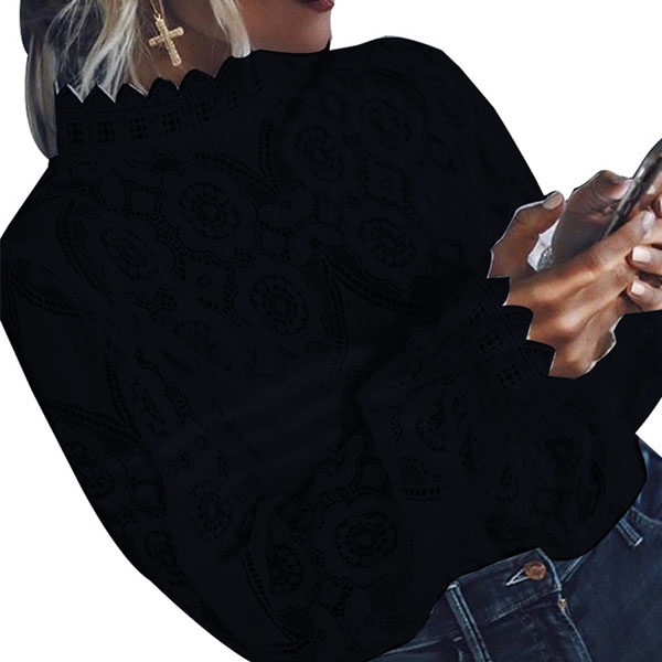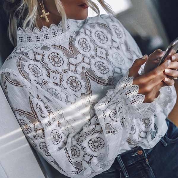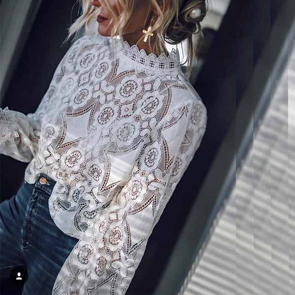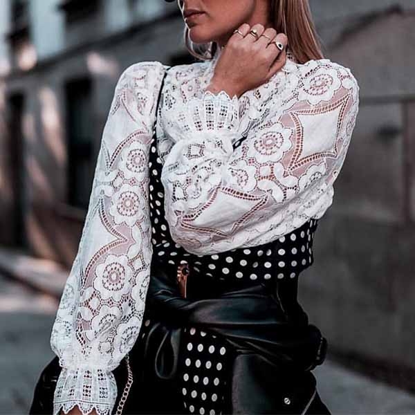 You'll exude your alluring feminine charm in this eye-catching shirt. The lace spliced details and embroideredpattern,