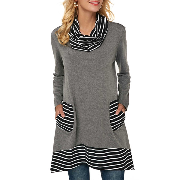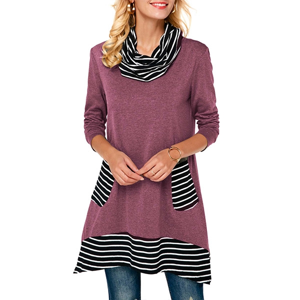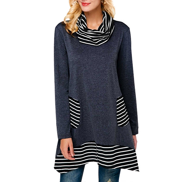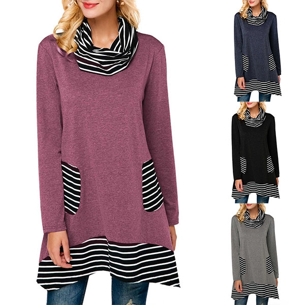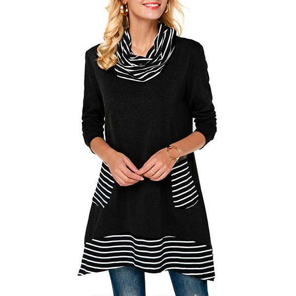 boast a loose silhouette with stripe high neckline, come with long sleeves, irregular hem with striped spliced accent,