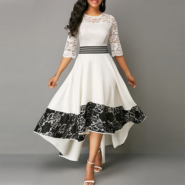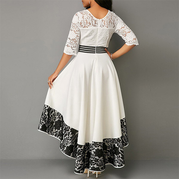 a lace spliced bodice, a round neck, middle sleeve, a high waist with contrast color design,