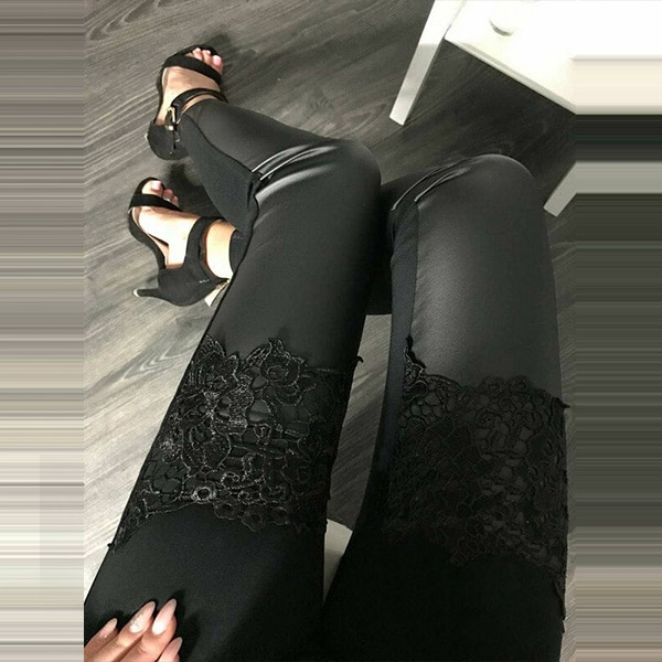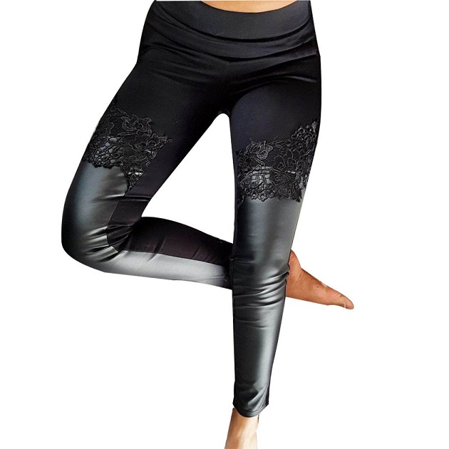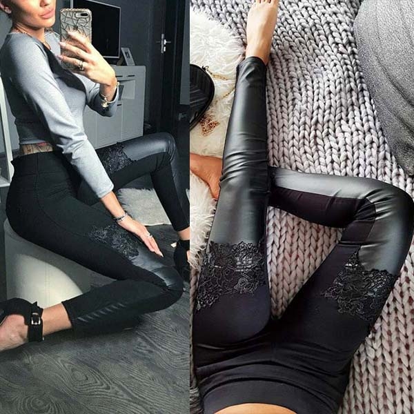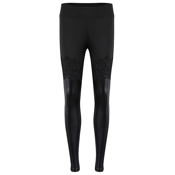Finished with high waist and a fit silhouette,the lace and PU leather spliced design will enrich