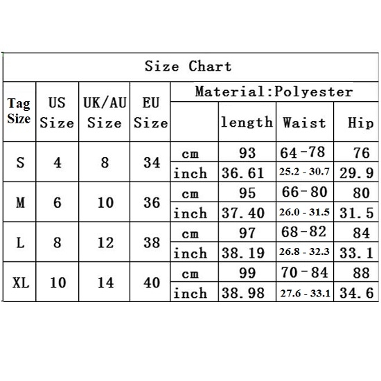 XL : Waist : 70cm - 84cm(27.56" - 33.07"); Hips : 88cm(34.65"); Length : 99cm(38.98");