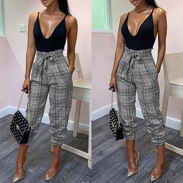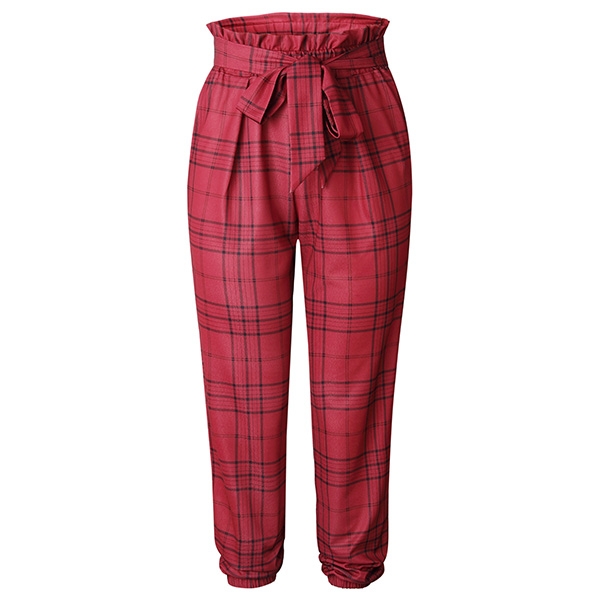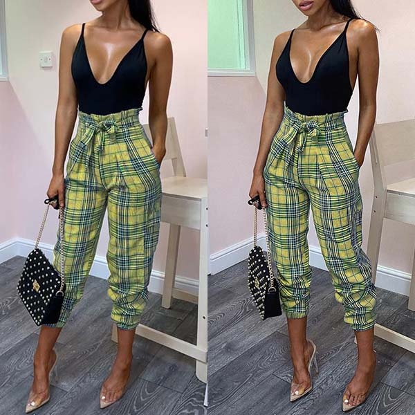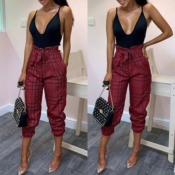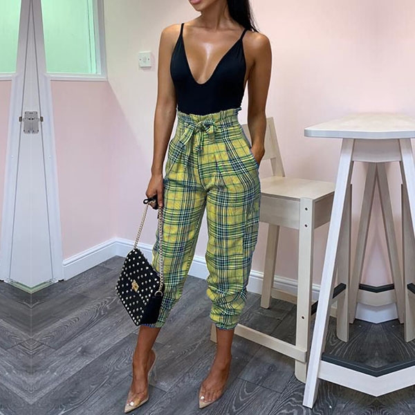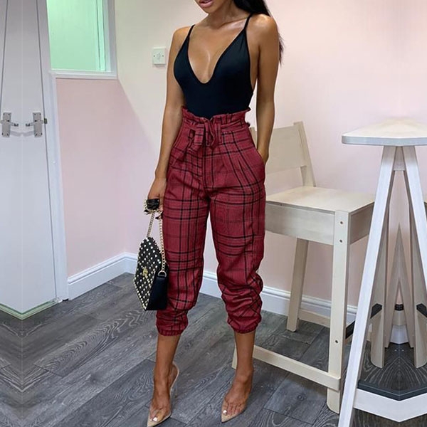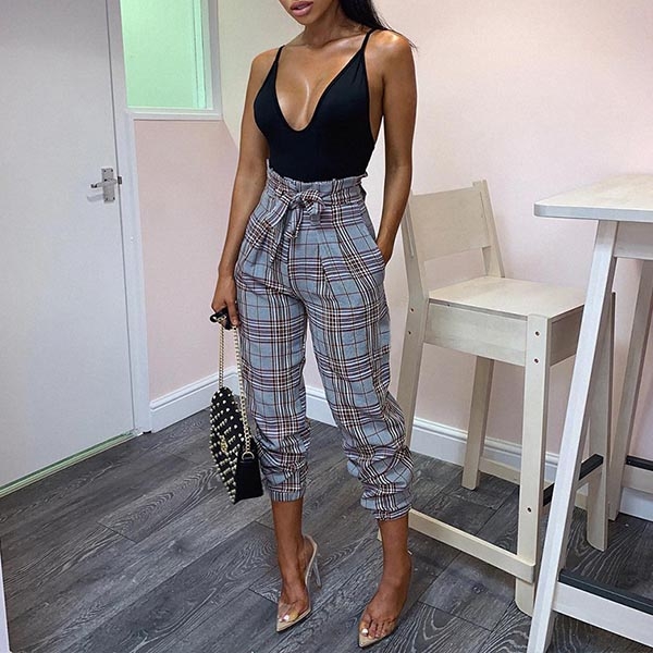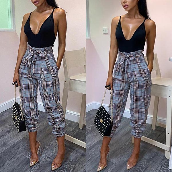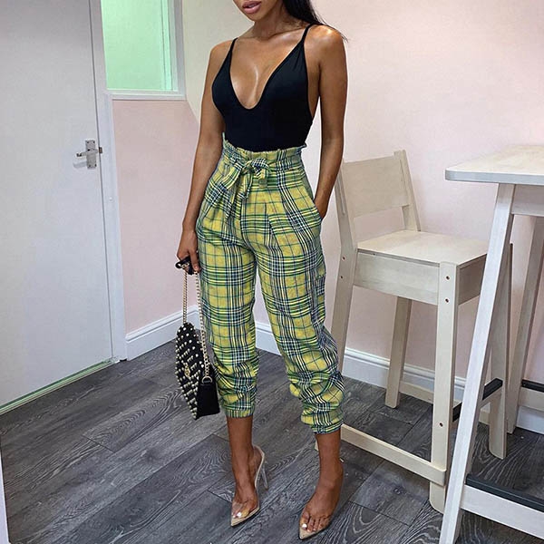 feature a fitted silhouette with allover plaid pattern print for a retro appeal, high rise waist with self-tie