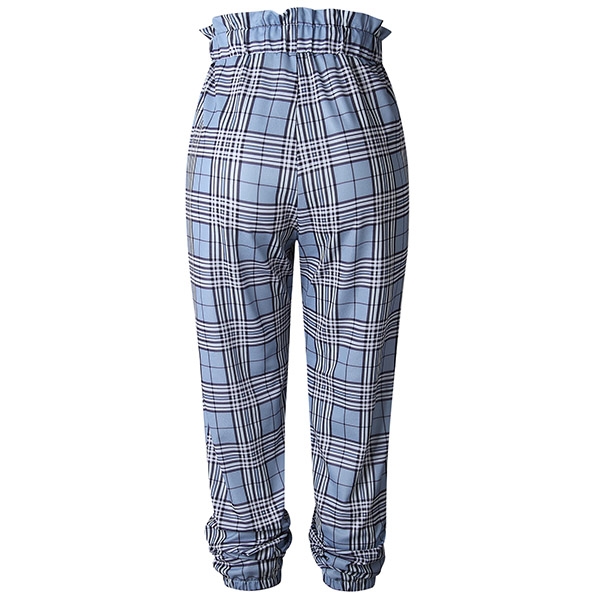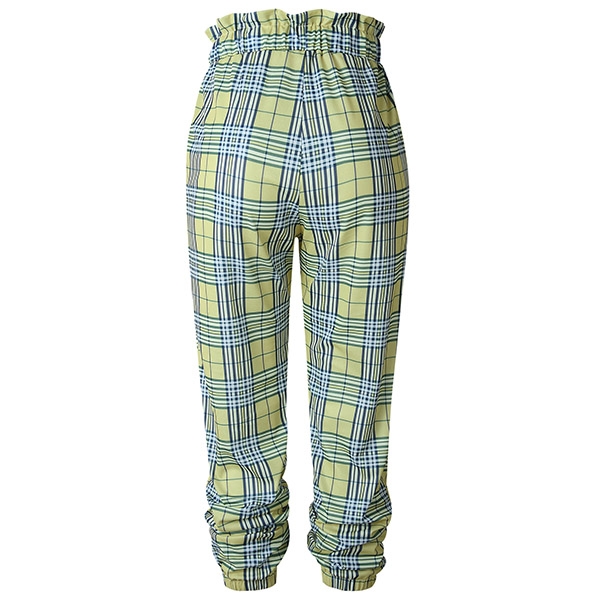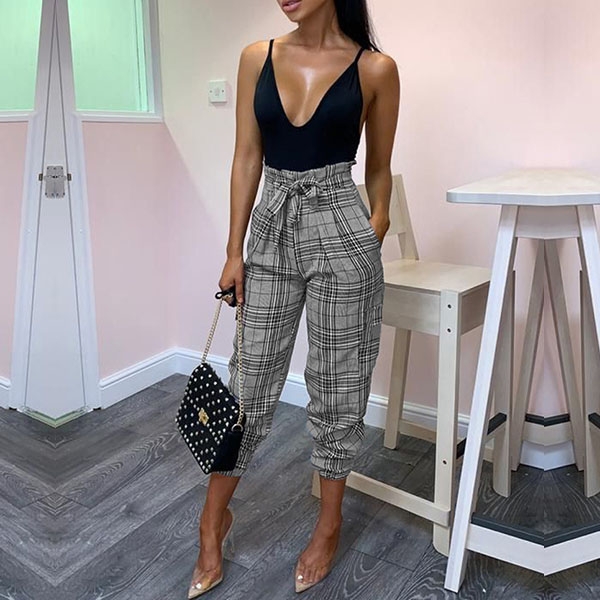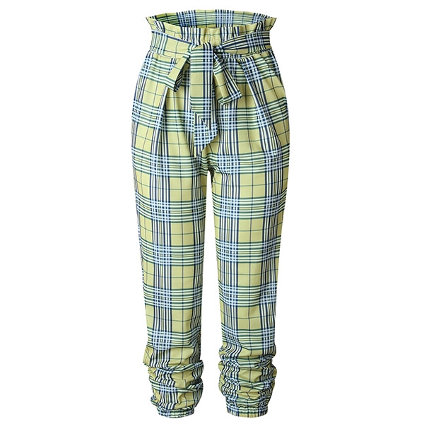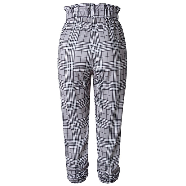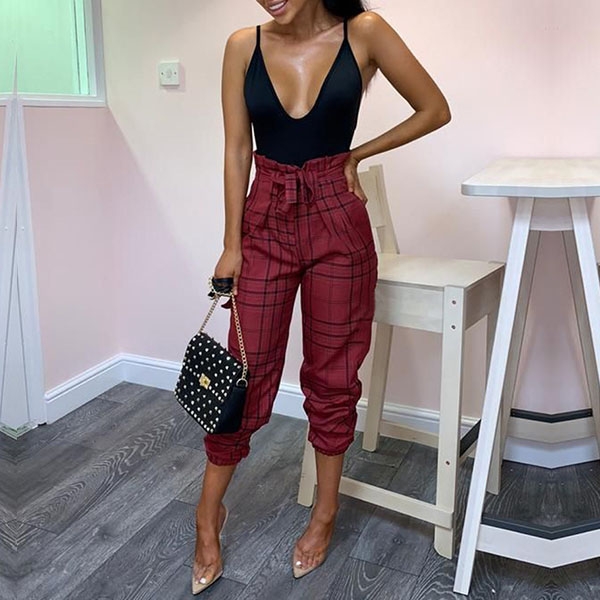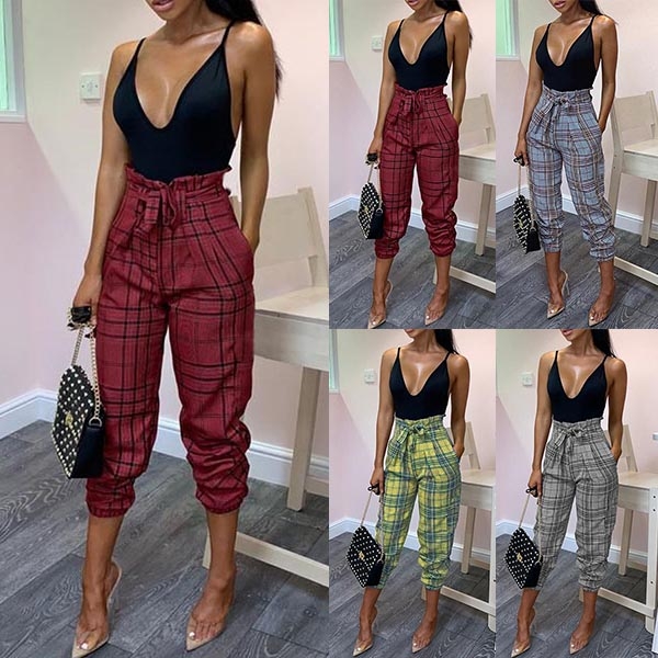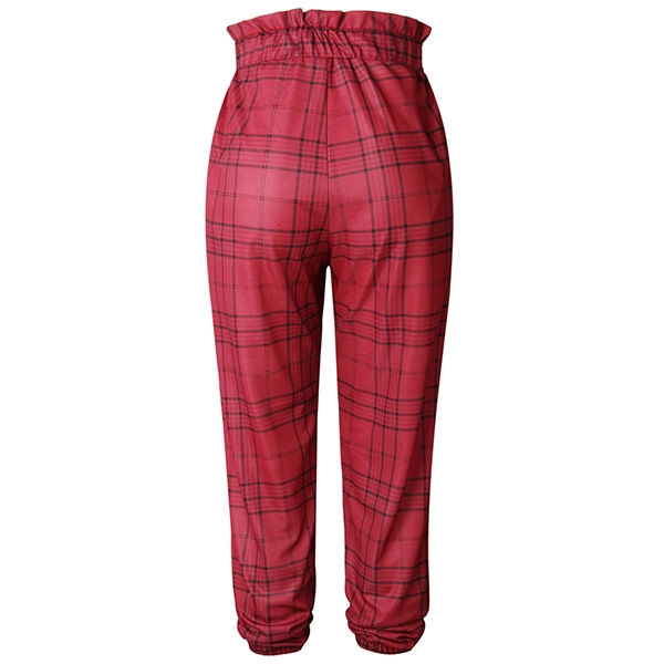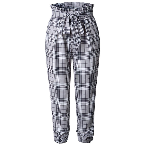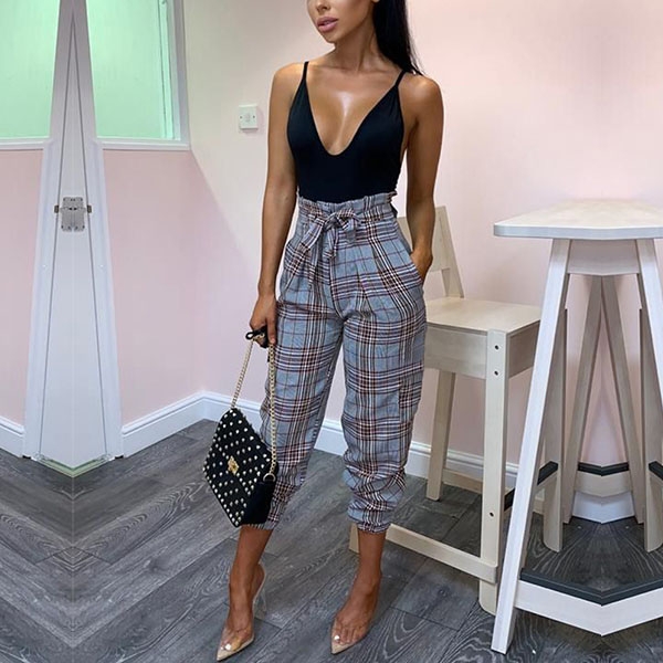 feature a fitted silhouette with allover plaid pattern print for a retro appeal, high rise waist with self-tie