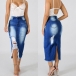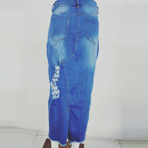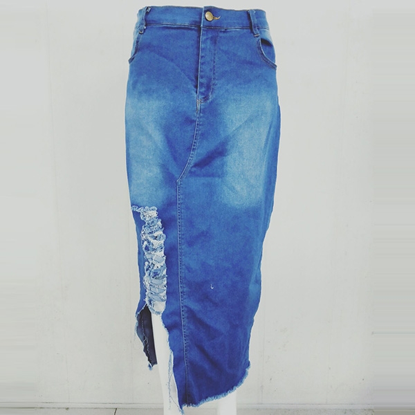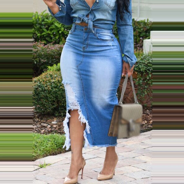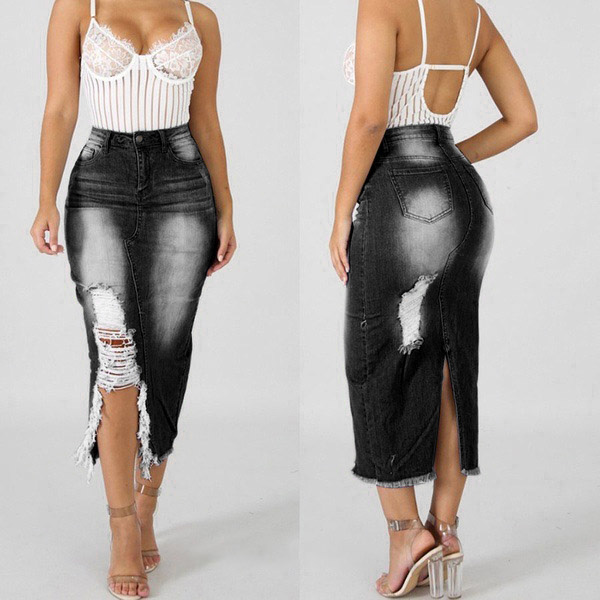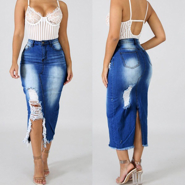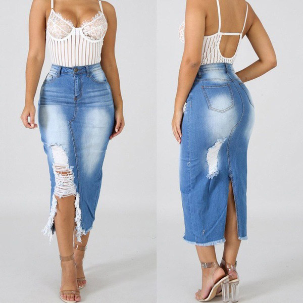 You can easily enhance your style with this denim skirt. The high waist and fit silhouette design can showcase your seductive hips and slender figure,while the slit hem and ripped details make this piece distinctive. No matter matching with your simple t-shirts,shirts,tank tops or crop tops,you can have a fashionable and charming look!
