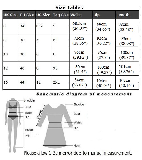 M : Waist : 72cm(28.35"); Hips : 92cm(36.22"); Length : 99cm(38.98");